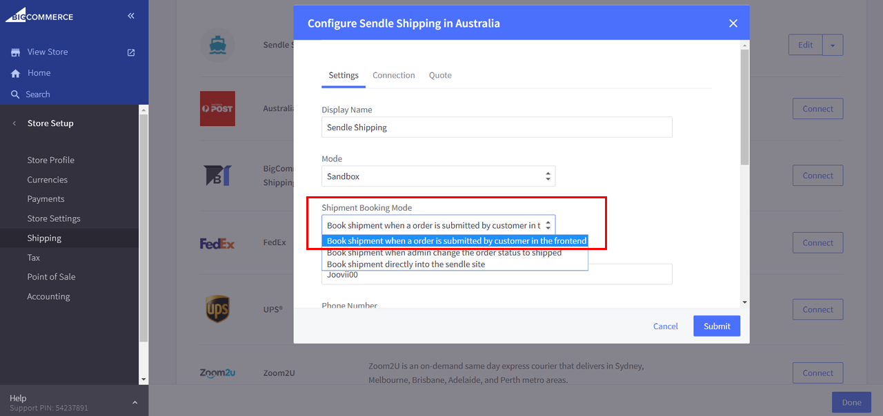 Next step is to set the shipping preferences / settings. In this step you can set “Sendle Api Mode (sandbox/live)” and “Shipment Booking Mode”.