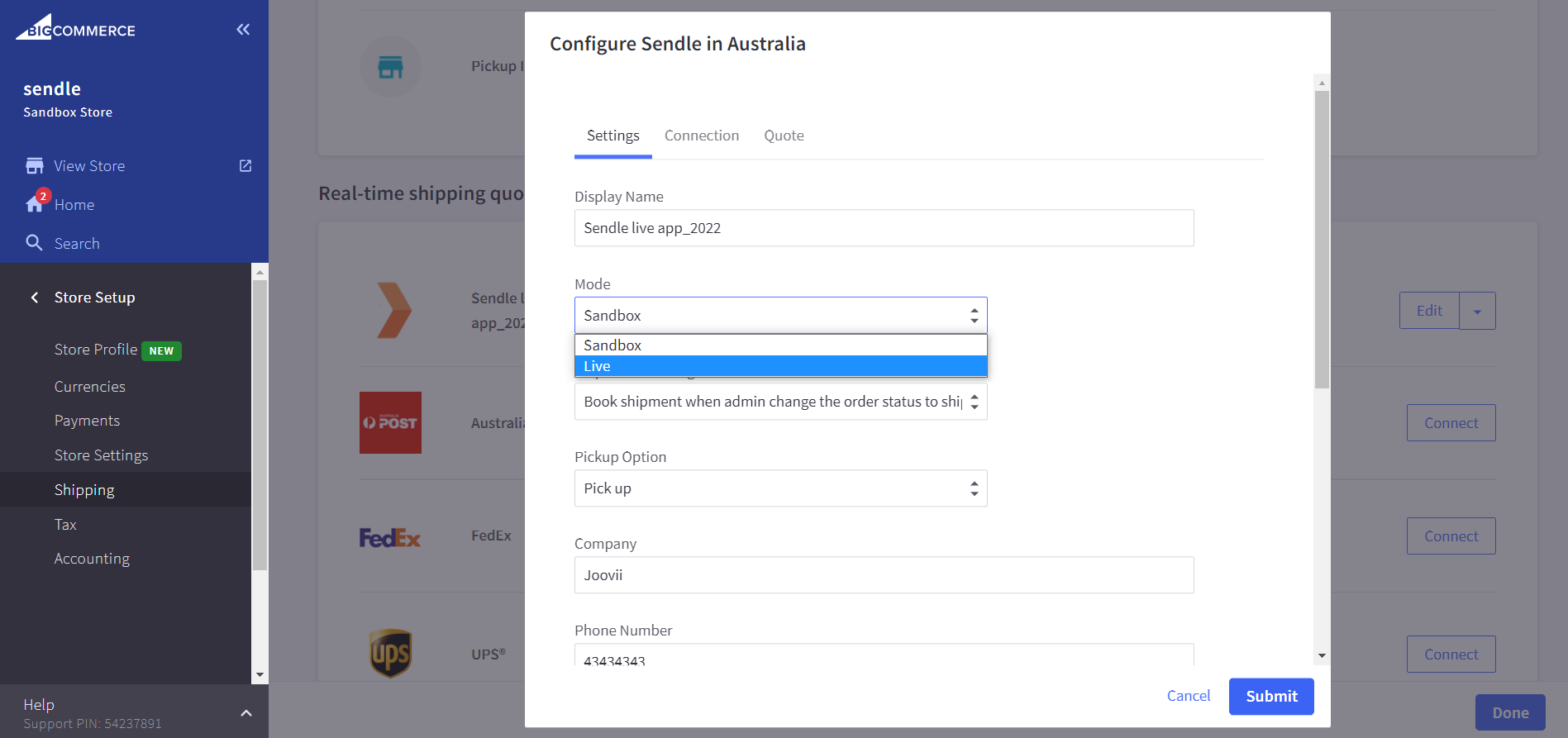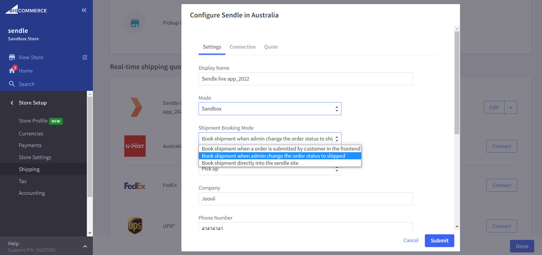 Next step is to set the shipping preferences / settings. In this step you can set “Sendle Api Mode (sandbox/live)” and “Shipment Booking Mode”.
