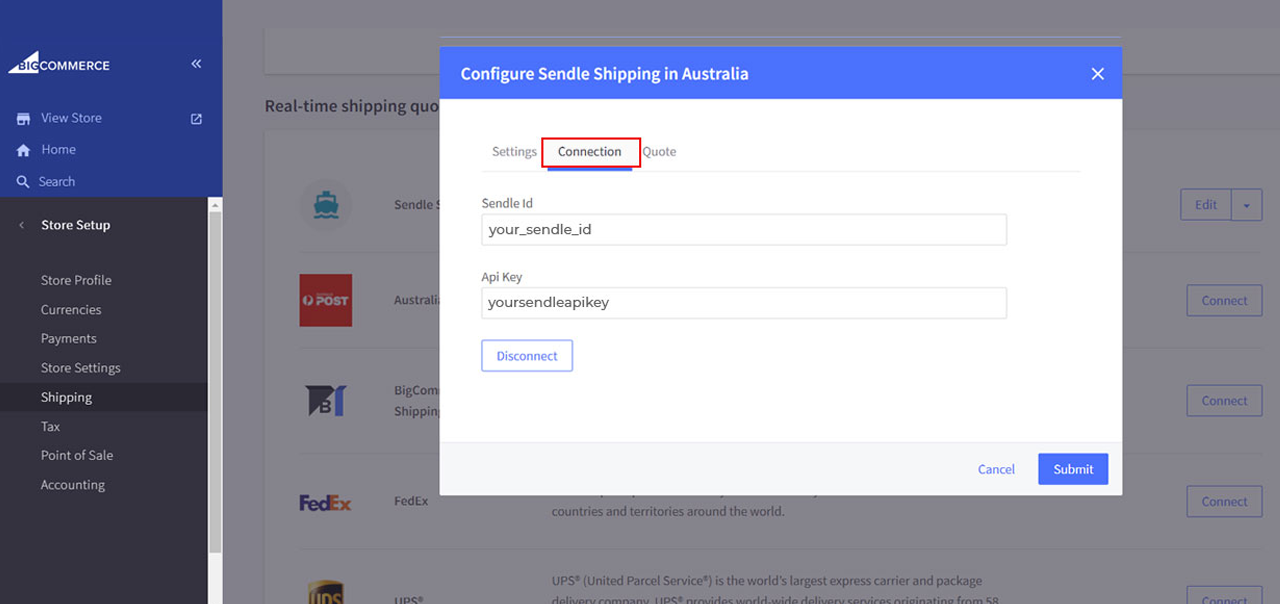 In the connection tab you can set the “Sendle Id and Api Key”.